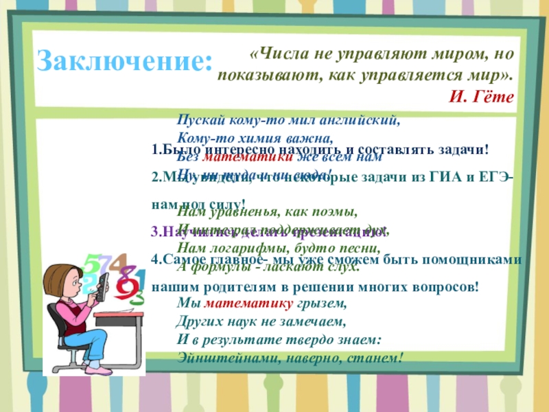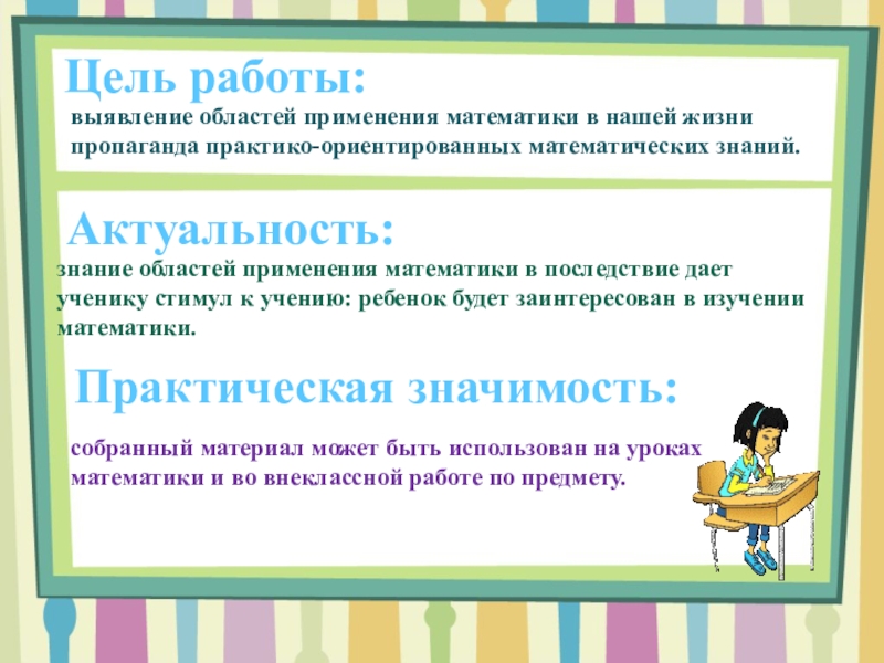 знание областей применения математики в последствие дает ученику стимул к учению: ребенок будет заинтересован в изучении математики.