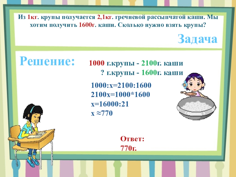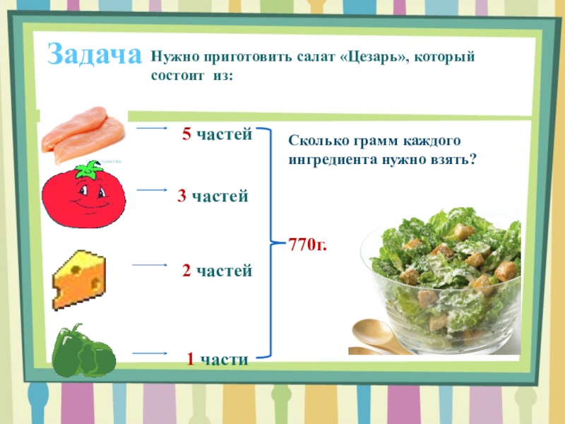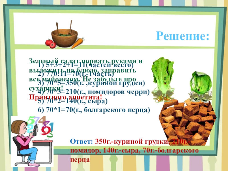 Ответ: 350г.-куриной грудки, 210г.-помидор, 140г.-сыра, 70г.-болгарского перца