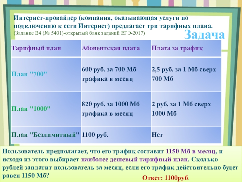 Пользователь предполагает, что его трафик составит 1150 Мб в месяц, и исходя из этого выбирает наиболее дешевый тарифный план. Сколько рублей заплатит пользователь за месяц, если его трафик действительно будет равен 1150 Мб?