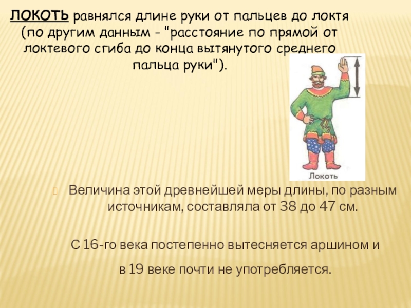 ЛОКОТЬ равнялся длине руки от пальцев до локтя (по другим данным - "расстояние по прямой от локтевого сгиба до конца вытянутого среднего пальца руки").