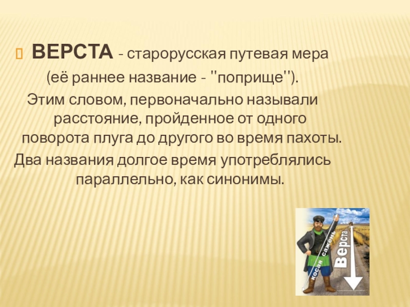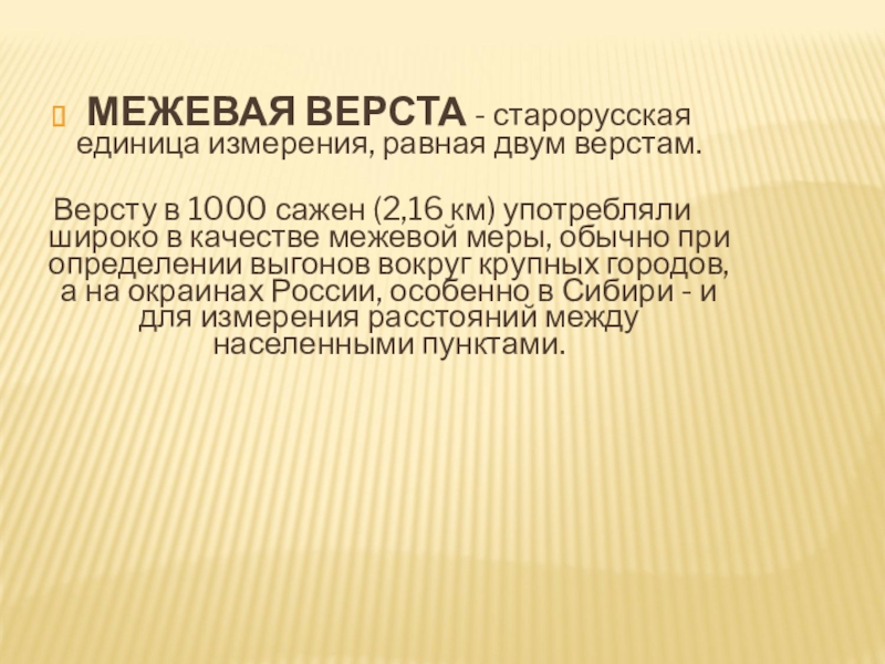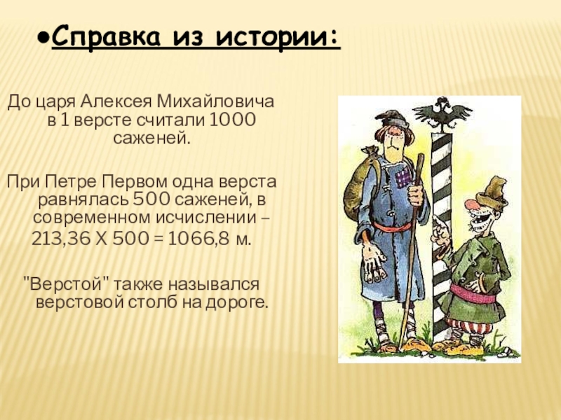 1 верста = 500 саженей = 50 шестов = 10 цепей = 1,0668 километра
