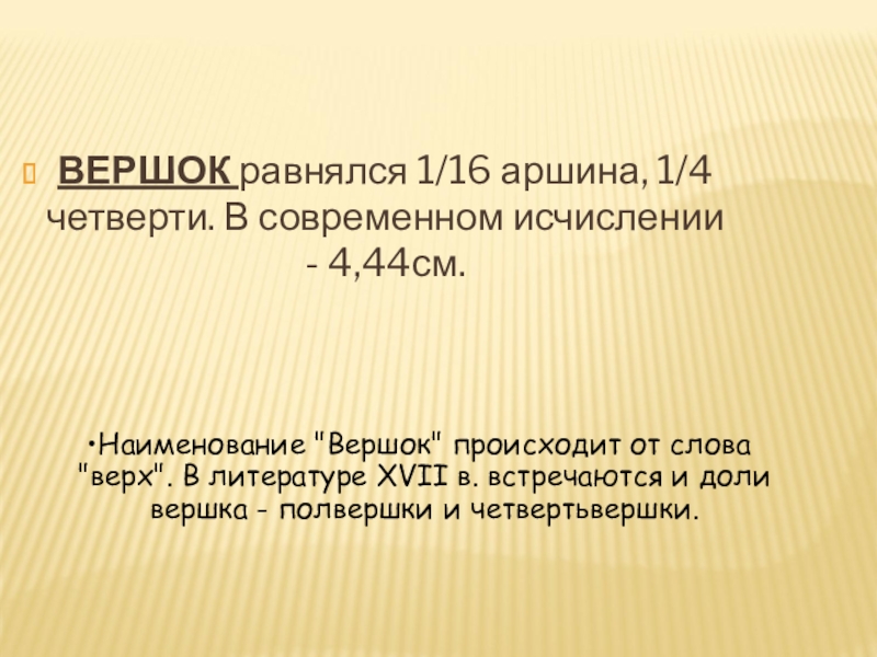 Наименование "Вершок" происходит от слова "верх". В литературе XVII в. встречаются и доли вершка - полвершки и четвертьвершки.