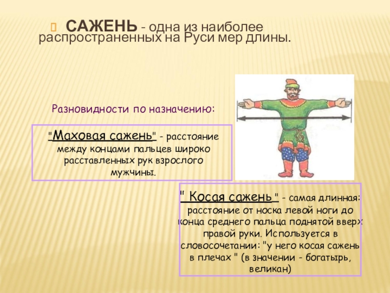 "Маховая сажень" - расстояние между концами пальцев широко расставленных рук взрослого мужчины.