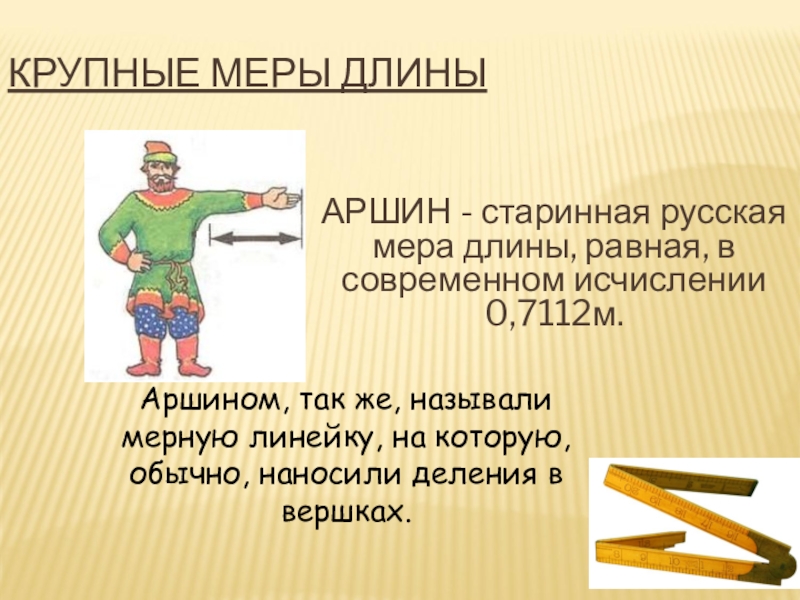 Аршином, так же, называли мерную линейку, на которую, обычно, наносили деления в вершках.