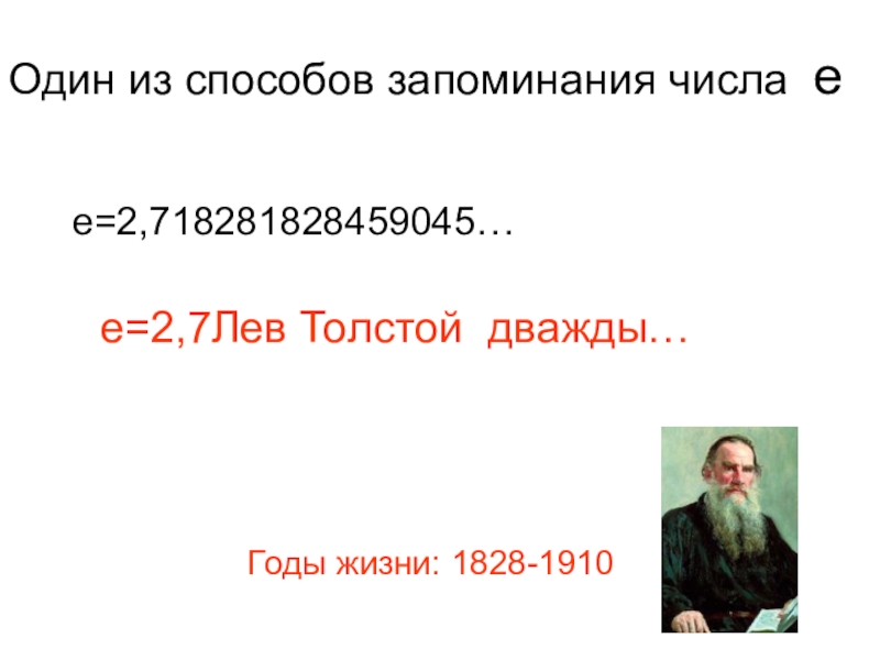 Один из способов запоминания числа еЕ=е=2,718281828459045…е=2,7Лев Толстой дважды…ГоГоды жизни: 1828-1910