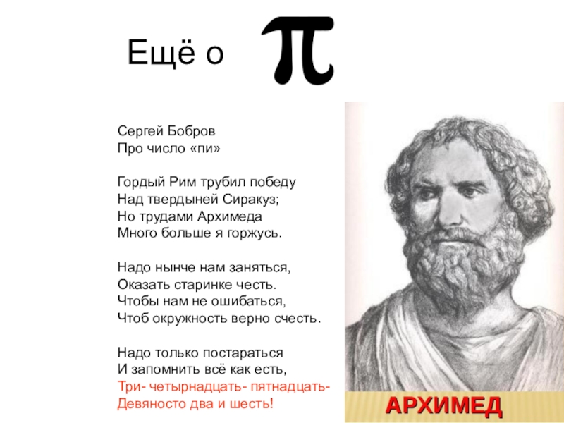Ещё оСергей БобровПро число «пи»Гордый Рим трубил победуНад твердыней Сиракуз;Но трудами АрхимедаМного больше я горжусь.Надо нынче нам
