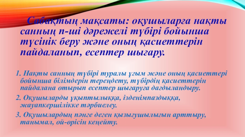 ТАҚЫРЫБЫ: НАҚТЫ САННЫҢ N-ШІ ДӘРЕЖЕЛІ ТҮБІРІ ЖӘНЕ ОНЫҢ