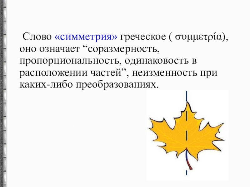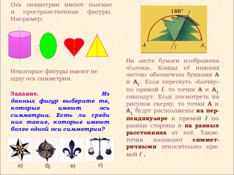 На листе бумаги изображена «ёлочка». Концы её нижних «веток» обозначены буквами A и A1. Если перегнуть «ёлочку» по прямой l, то точки A и A1 совпадут. Если посмотреть на рисунок сверху, то точки A и A1 будут расположены на пер-пендикуляре к прямой l по разные стороны и на равных расстояниях от неё. Такие точки называют симмет-ричными относительно пря-мой l .