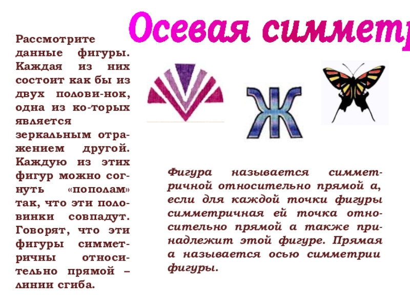 Рассмотрите данные фигуры. Каждая из них состоит как бы из двух полови-нок, одна из ко-торых является зеркальным отра-жением другой. Каждую из этих фигур можно сог-нуть «пополам» так, что эти поло-винки совпадут. Говорят, что эти фигуры симмет-ричны относи-тельно прямой – линии сгиба.