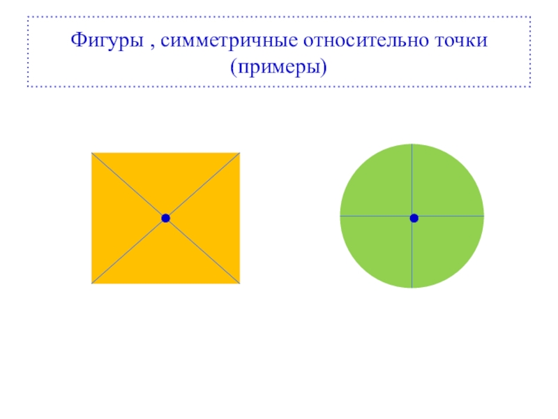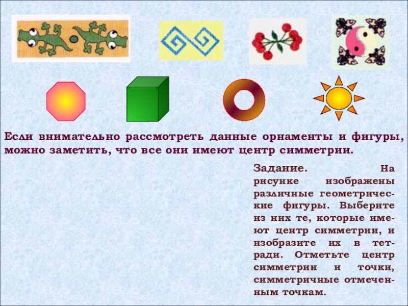 Задание. На рисунке изображены различные геометричес-кие фигуры. Выберите из них те, которые име-ют центр симметрии, и изобразите их в тет-ради. Отметьте центр симметрии и точки, симметричные отмечен-ным точкам.