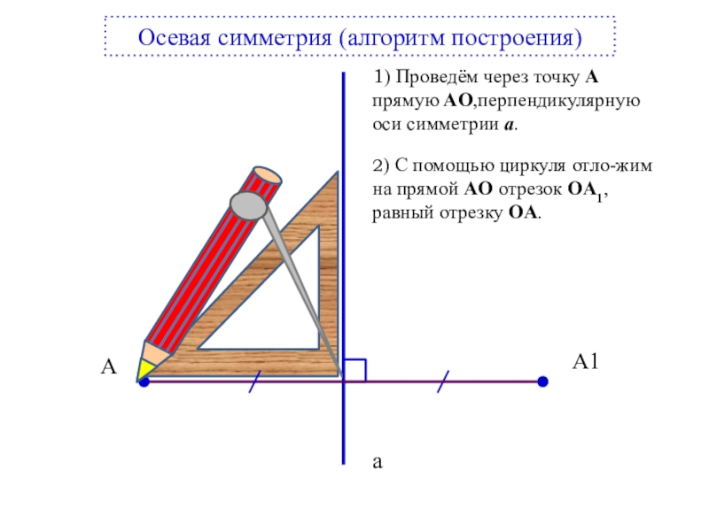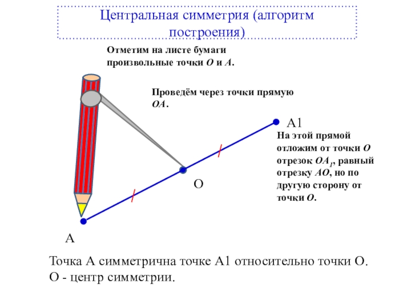 2) С помощью циркуля отло-жим на прямой АO отрезок OА1, равный отрезку OА.
