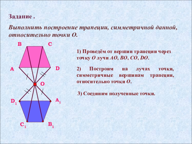 2) Построим на лучах точки, симметричные вершинам трапеции, относительно точки O.