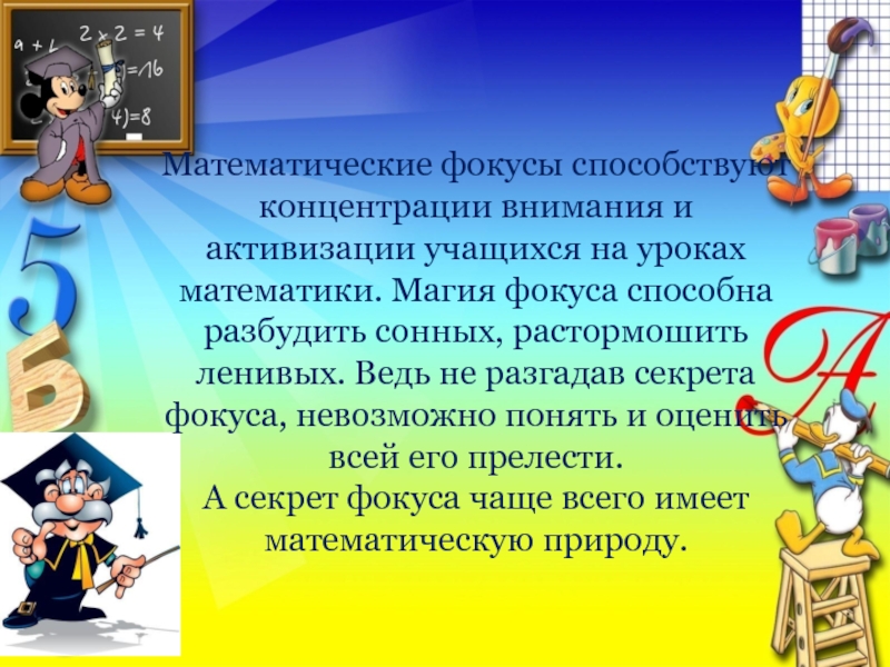 Слайд 13Математические фокусы способствуют концентрации внимания и активизации учащихся на уроках математики.