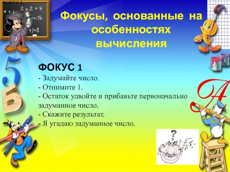 Фокусы, основанные на особенностях вычисления ФОКУС 1ФОКУС 1- Задумайте число.- Отнимите 1.- Остаток удвойте и прибавьте первоначальнозадуманное число.-