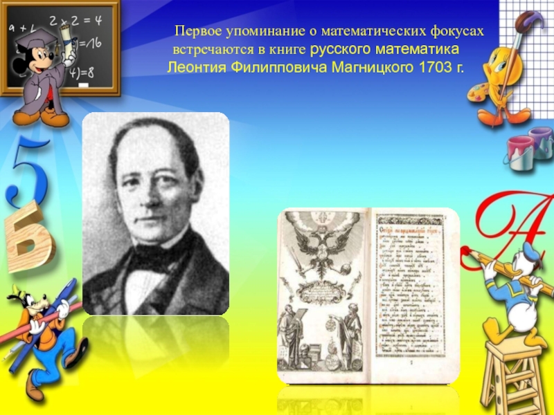 Первое упоминание о математических фокусах встречаются в книге русского математика Леонтия Филипповича Магницкого 1703 г.