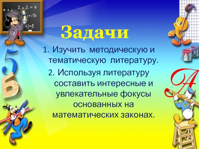 ЗадачиИзучить методическую и тематическую литературу.Используя литературу составить интересные и увлекательные фокусы основанных на математических законах.