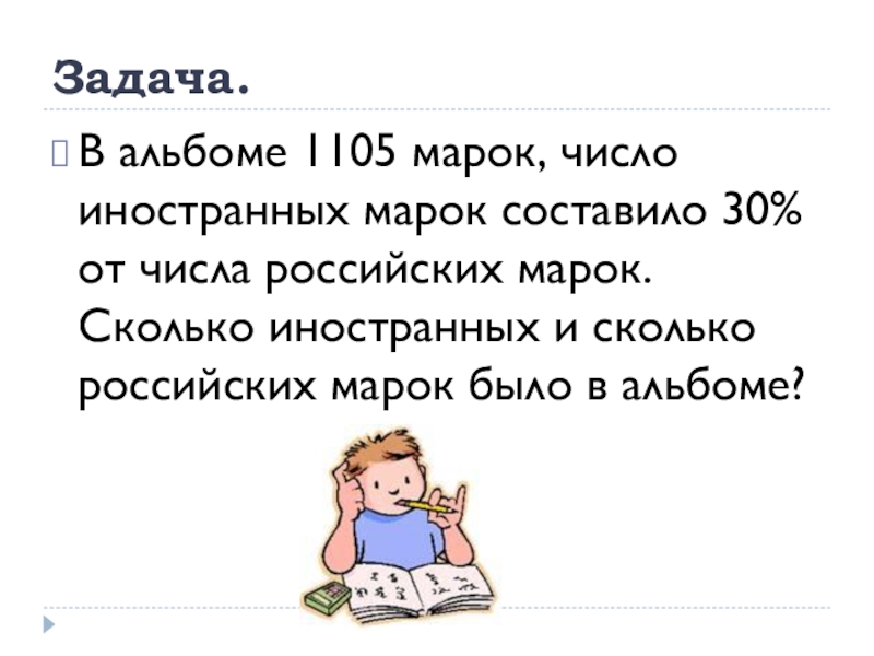 Задача. В альбоме 1105 марок, число иностранных марок составило 30% от числа российских марок. Сколько иностранных и сколько