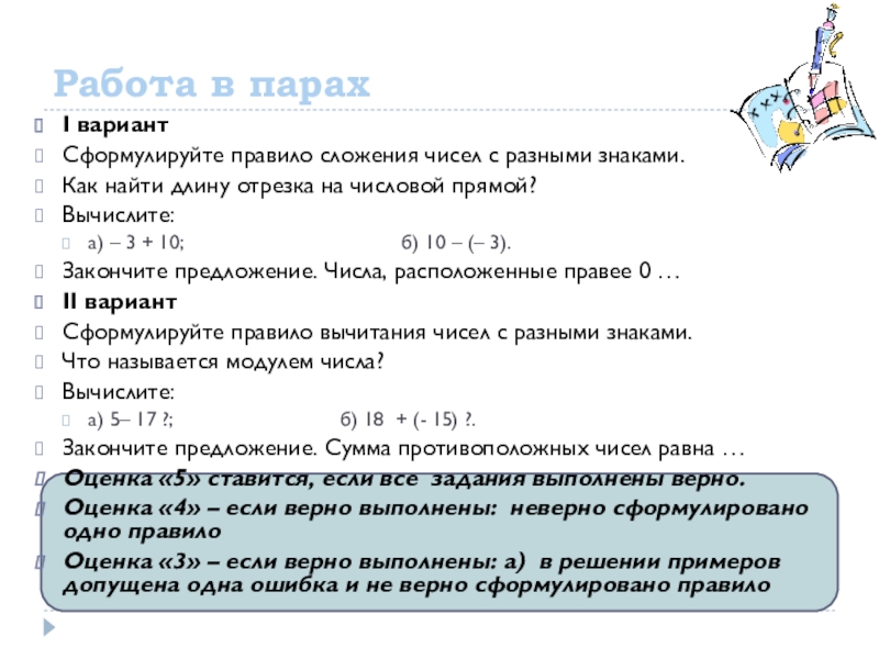 Работа в парахI вариантСформулируйте правило сложения чисел с разными знаками.Как найти длину отрезка на числовой прямой?Вычислите:а) –
