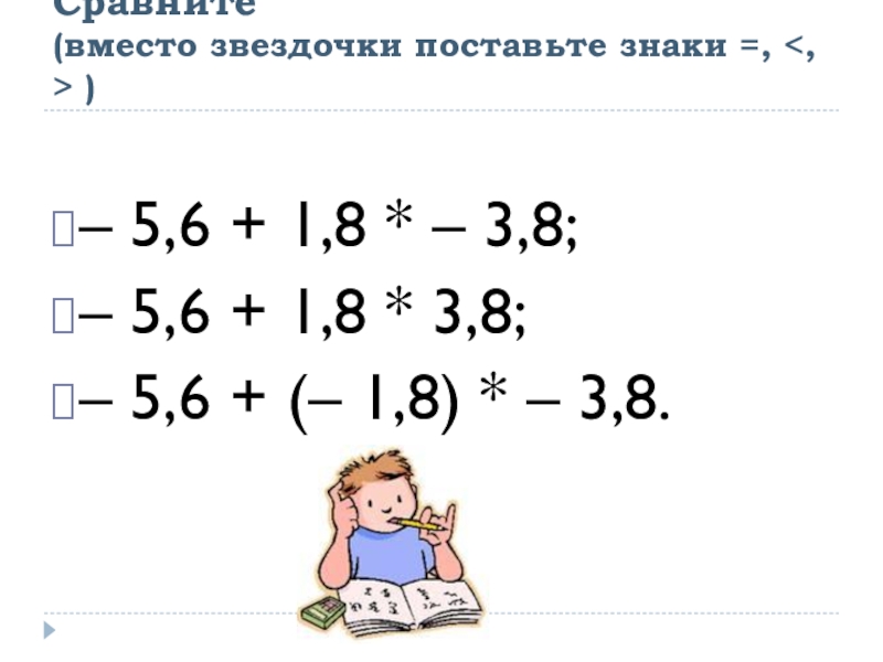 Сравните  (вместо звездочки поставьте знаки =, )– 5,6 + 1,8 * – 3,8;– 5,6 + 1,8