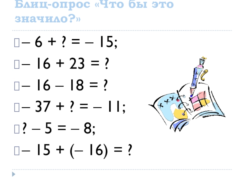 Блиц-опрос «Что бы это значило?» – 6 + ? = – 15;– 16 + 23 = ?– 16 – 18 = ?– 37 + ? = – 11;? – 5 = – 8;– 15 + (–