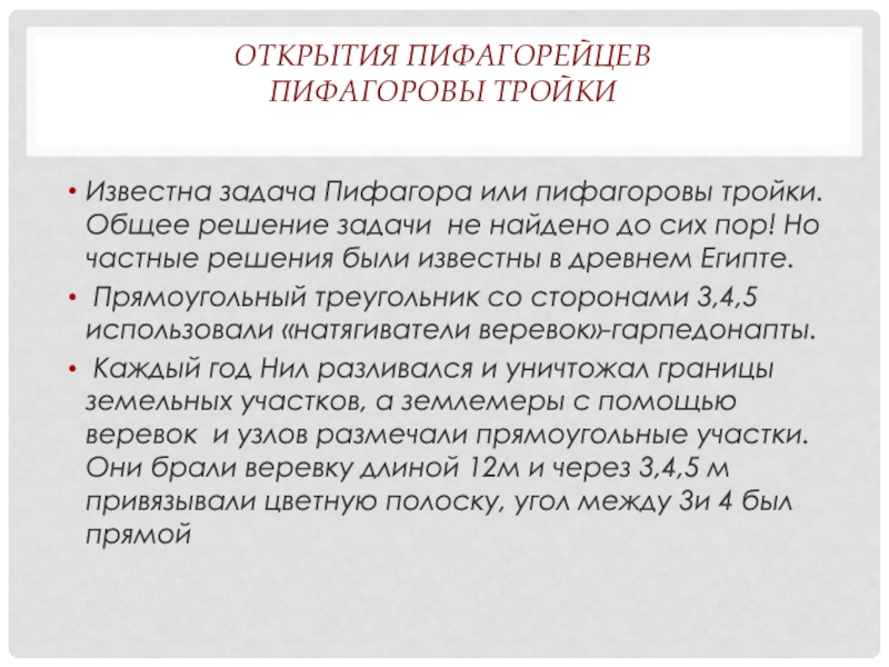 Каждый год Нил разливался и уничтожал границы земельных участков, а землемеры с помощью веревок и узлов размечали прямоугольные участки. Они брали веревку длиной 12м и через 3,4,5 м привязывали цветную полоску, угол между 3и 4 был прямой