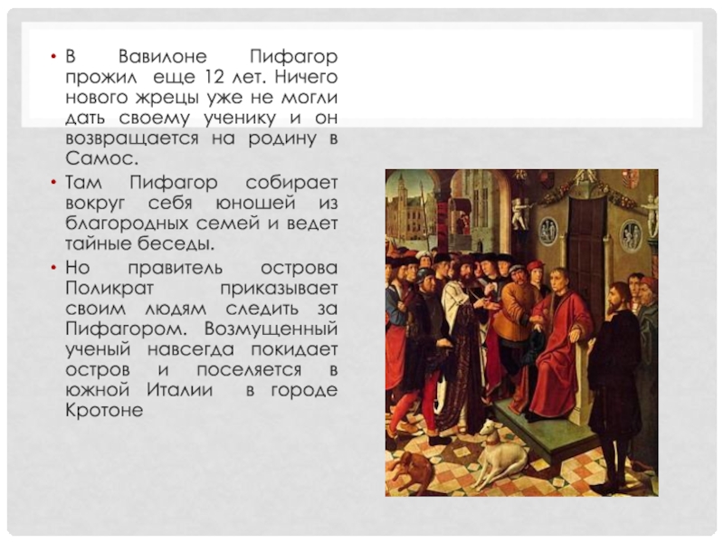 Но правитель острова Поликрат приказывает своим людям следить за Пифагором. Возмущенный ученый навсегда покидает остров и поселяется в южной Италии в городе Кротоне