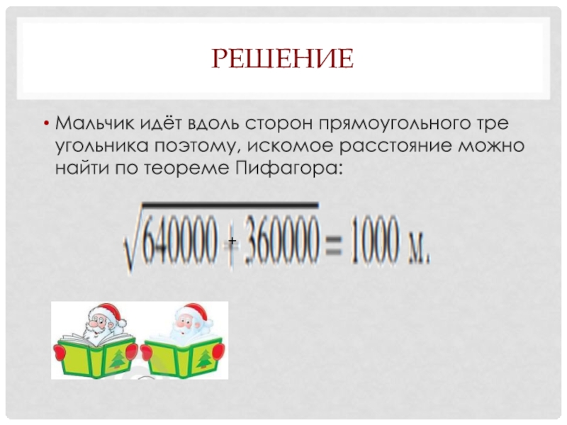 Мальчик идёт вдоль сторон прямоугольного треугольника поэтому, искомое расстояние можно найти