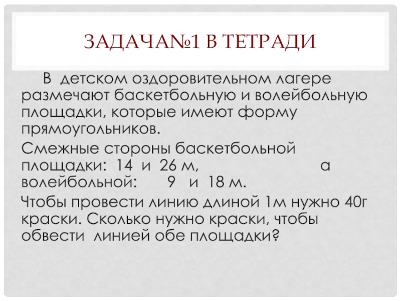 Чтобы провести линию длиной 1м нужно 40г краски. Сколько нужно краски, чтобы обвести линией обе площадки?