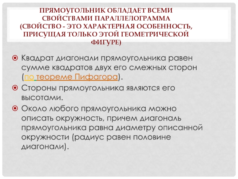 Слайд 16Прямоугольник обладает всеми свойствами параллелограмма