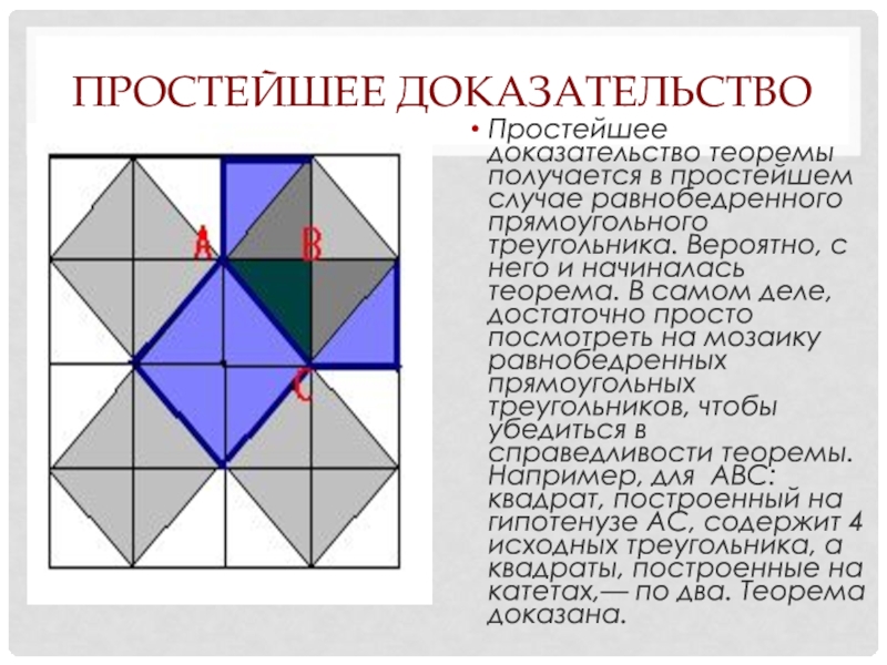 Вероятно, с него и начиналась теорема. В самом деле, достаточно просто посмотреть на мозаику равнобедренных прямоугольных треугольников, чтобы убедиться в справедливости теоремы. Например, для ABC: квадрат, построенный на гипотенузе АС, содержит 4 исходных треугольника, а квадраты, построенные на катетах,— по два. Теорема доказана.