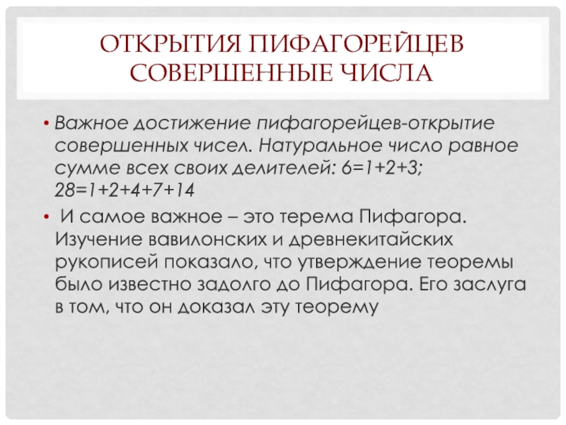 Важное достижение пифагорейцев-открытие совершенных чисел. Натуральное число равное сумме