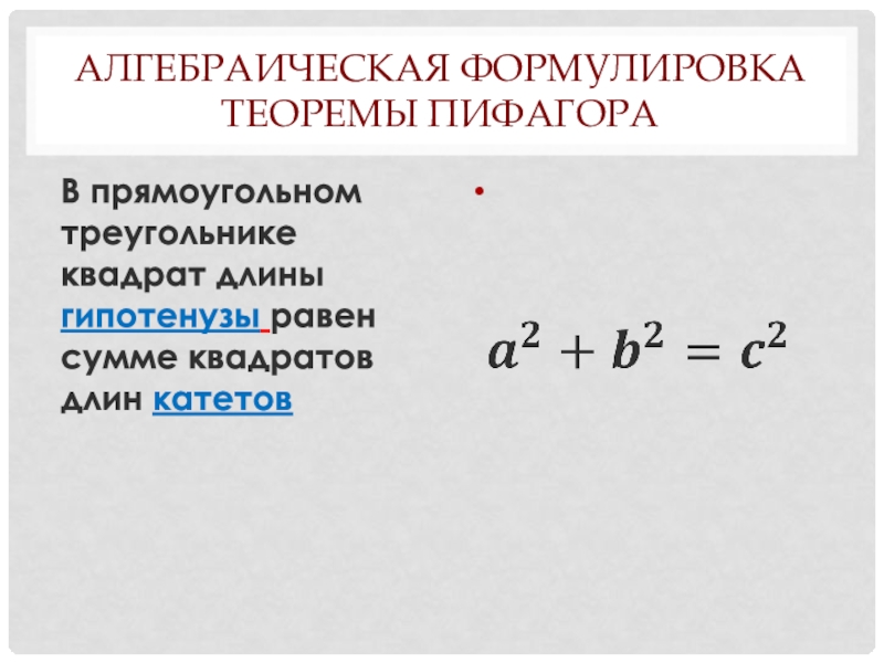 Слайд 39Алгебраическая формулировка теоремы Пифагора