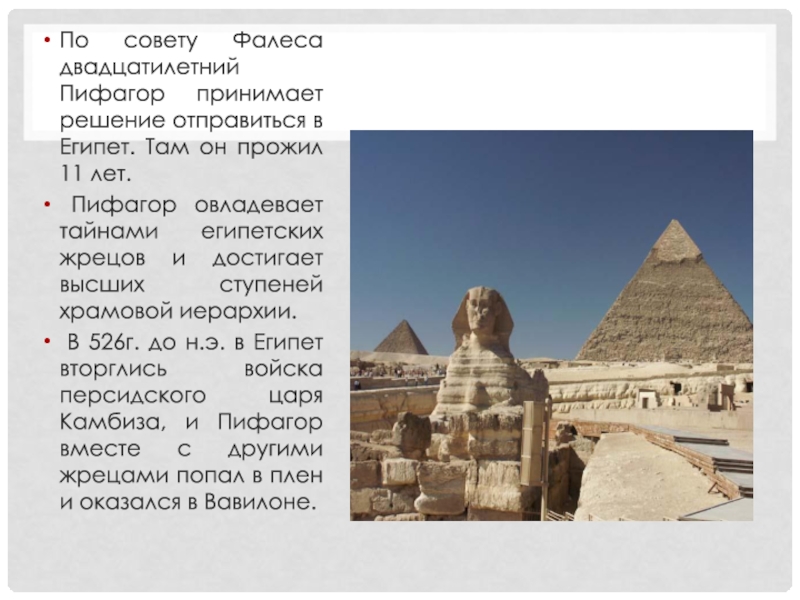 Слайд 32По совету Фалеса двадцатилетний Пифагор принимает решение отправиться в Египет. Там