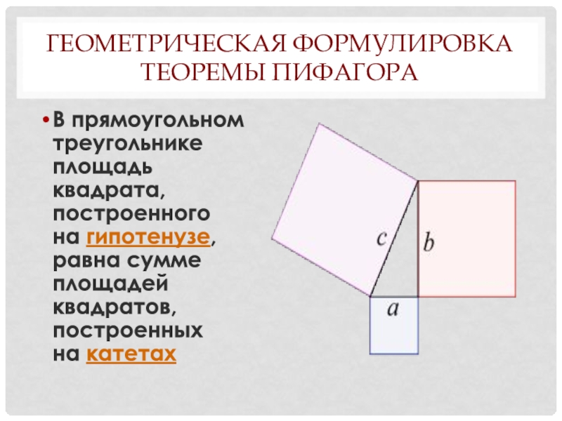 Слайд 38Геометрическая формулировка теоремы Пифагора