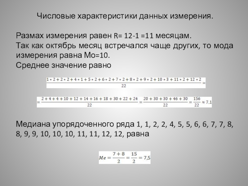 октябрь месяц встречался чаще других, то мода измерения равна Мо=10.