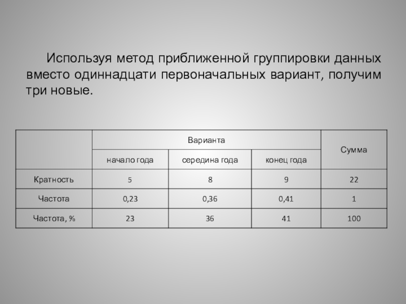 Используя метод приближенной группировки данных вместо одиннадцати первоначальных вариант, получим три