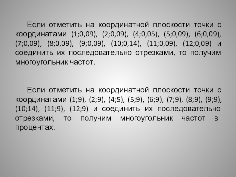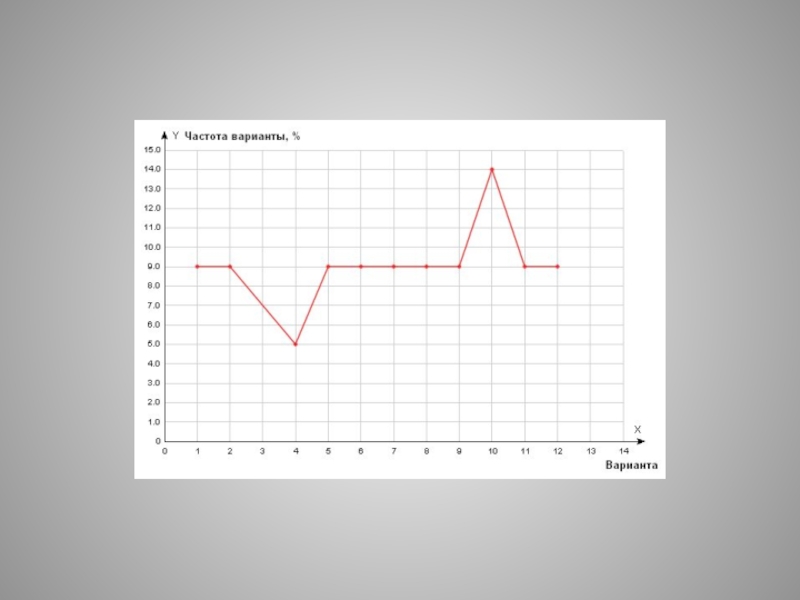 Если отметить на координатной плоскости точки с координатами (1;9), (2;9), (4;5), (5;9), (6;9), (7;9), (8;9), (9;9), (10;14), (11;9), (12;9) и соединить их последовательно отрезками, то получим многоугольник частот в процентах.