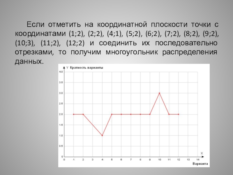 (5;2), (6;2), (7;2), (8;2), (9;2), (10;3), (11;2), (12;2) и соединить их последовательно отрезками, то получим многоугольник распределения данных.
