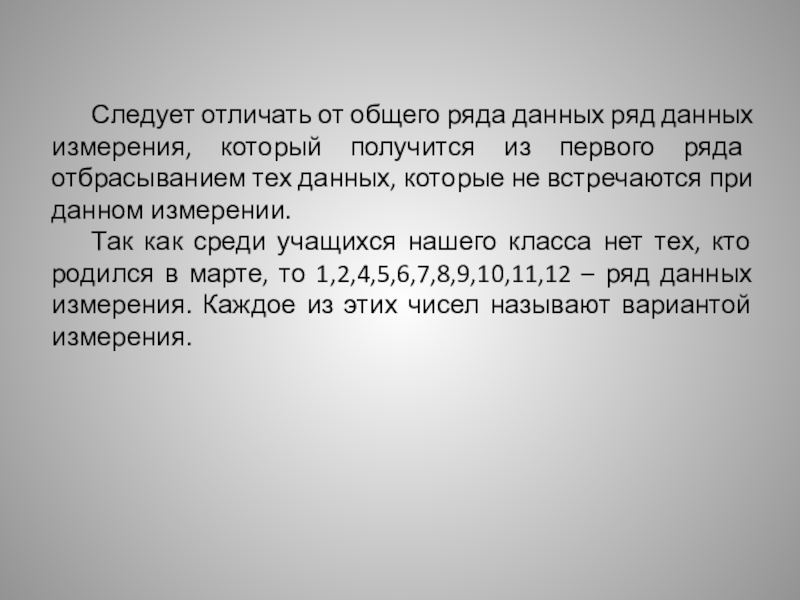 Так как среди учащихся нашего класса нет тех, кто родился в марте, то 1,2,4,5,6,7,8,9,10,11,12 – ряд данных измерения. Каждое из этих чисел называют вариантой измерения.