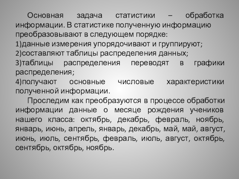 Проследим как преобразуются в процессе обработки информации данные о месяце рождения учеников нашего класса: октябрь, декабрь, февраль, ноябрь, январь, июнь, апрель, январь, декабрь, май, май, август, июнь, июль, сентябрь, февраль, июль, август, октябрь, сентябрь, октябрь, ноябрь.