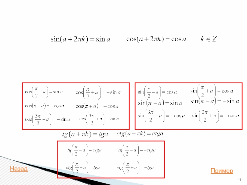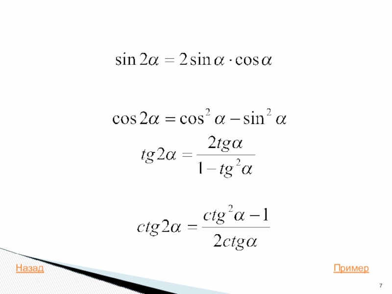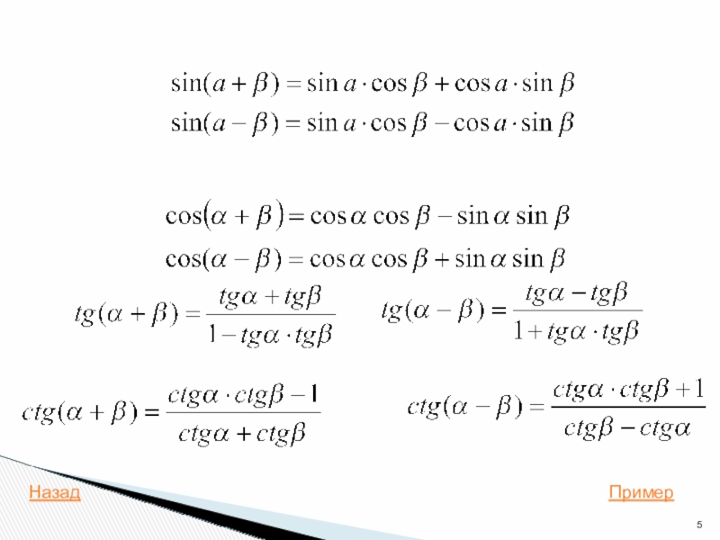 Тригонометрические формулыТригонометрические тождества.Формулы сложения.Формулы двойного аргумента.Формулы половинного аргумента.Формулы приведения.Формулы преобразования суммы и разности в произведение.Формулы преобразования произведения в сумму.