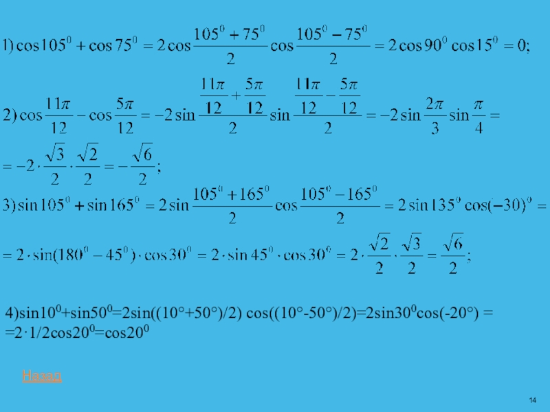 Слайд 144)sin100+sin500=2sin((10°+50°)/2) cos((10°-50°)/2)=2sin300cos(-20°) = =2·1/2cos200=cos200