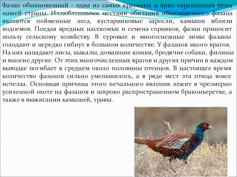 Слайд 9Фазан обыкновенный - одна из самых красивых и ярко окрашенных птиц