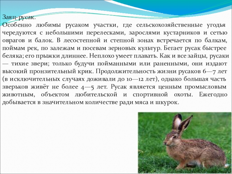 зарослями кустарников и сетью оврагов и балок. В лесостепной и степной зонах встречается по балкам, поймам рек, по залежам и посевам зерновых культур. Бегает русак быстрее беляка; его прыжки длиннее. Неплохо умеет плавать. Как и все зайцы, русаки — тихие звери; только будучи пойманными или раненными, они издают высокий пронзительный крик. Продолжительность жизни русаков 6—7 лет (в исключительных случаях доживали до 10—12 лет), однако большая часть зверьков живёт не более 4—5 лет. Русак является ценным промысловым животным, объектом любительской и спортивной охоты. Ежегодно добывается в значительном количестве ради мяса и шкурок.