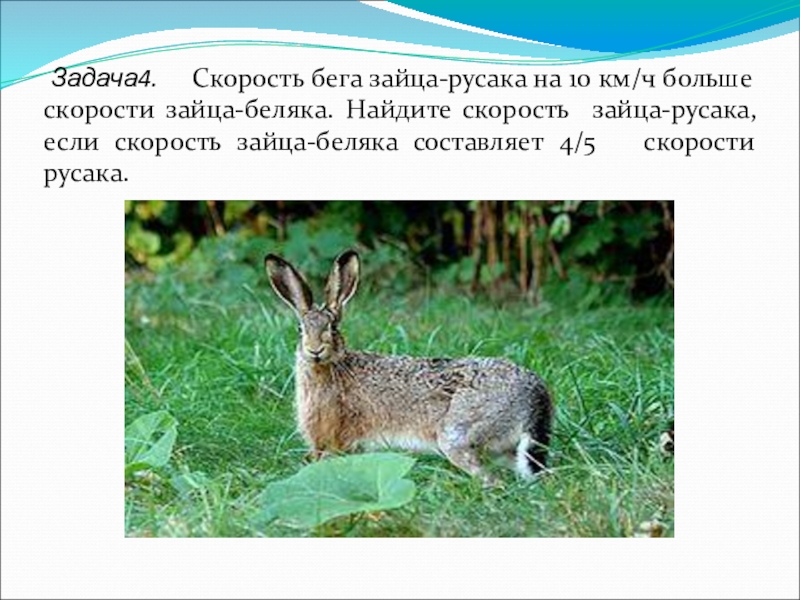 на 10 км/ч больше скорости зайца-беляка. Найдите скорость зайца-русака, если скорость зайца-беляка составляет 4/5 скорости русака.