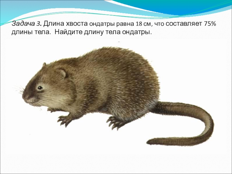 Слайд 14Задача 3. Длина хвоста ондатры равна 18 см, что составляет 75%
