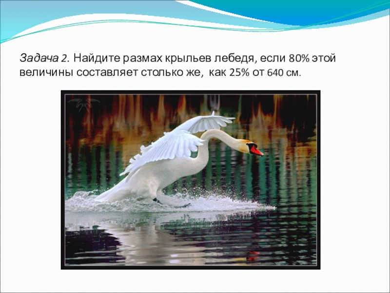 Слайд 12Задача 2. Найдите размах крыльев лебедя, если 80% этой величины составляет