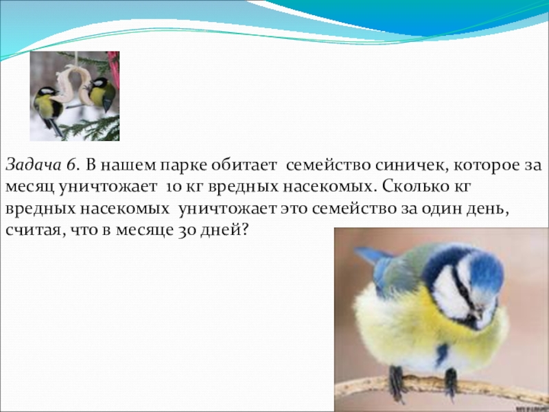 Слайд 18Задача 6. В нашем парке обитает семейство синичек, которое за месяц