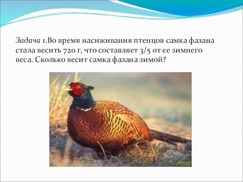 Слайд 10Задача 1.Во время насиживания птенцов самка фазана стала весить 720 г,