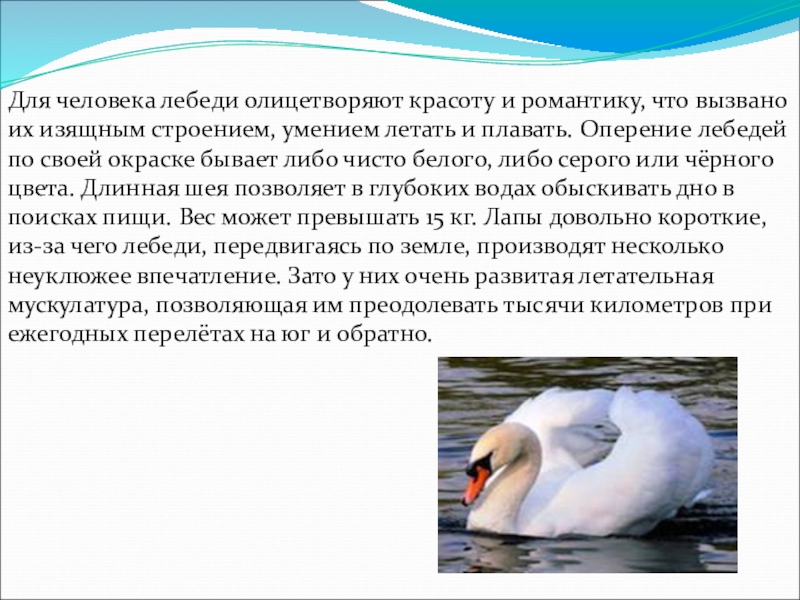 Слайд 11Для человека лебеди олицетворяют красоту и романтику, что вызвано их изящным